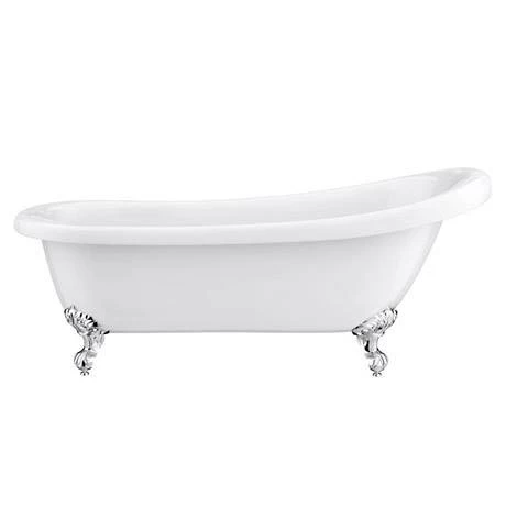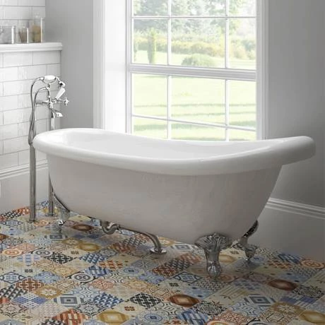 A stunning 1710mm long slipper bath with traditional chrome feet, enjoy the feeling of luxury with this classical free-standing bath. This elegant slipper roll top bath is the perfect centrepiece for a traditional bathroom. The bath is mounted upon traditional chrome feet to complete a breathtaking appearance. Made with double skinned acrylic with a superb surface finish. Slipper bath has no tap holes and a continuous rolled rim.